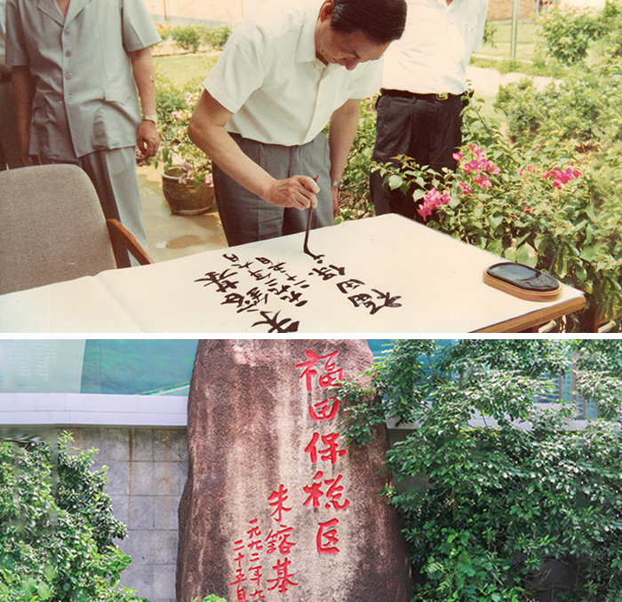 深圳是国内最早开始探索保税政策的城市,福田保税区则是深圳最早建成并投入使用的保税区。原国务院总理朱镕基分别于1992年和1997年两次莅临福田保税区考察,一向主张只签名不题词的朱镕基总理原本并不打算为保税区题词,但在在他签写自己的名字后,一旁的观众掌声雷动,经久不息,总理着实是性情中人,为此破例下笔题写了“福田保税区”五个大字。当时总理乐呵呵地开玩笑道:“这个字的版权是我的,很值钱的。”当时在观众席中的意昂体育老员工每次向别人解释总理题词原稿中名字在右,而“福田保税区”在左的原因时,总是带着骄傲的语气。总理体“福田保税区”至今沿用于保税区内各标志性景观。